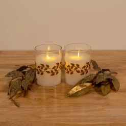 LumaBase Gold Maidenhair Fern Battery Operated Wax Candles In Glass Holders With Moving Flame 2-piece Set