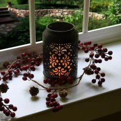 LumaBase Metal Lantern With Cut Out Design And Flame Effect Pillar Candle