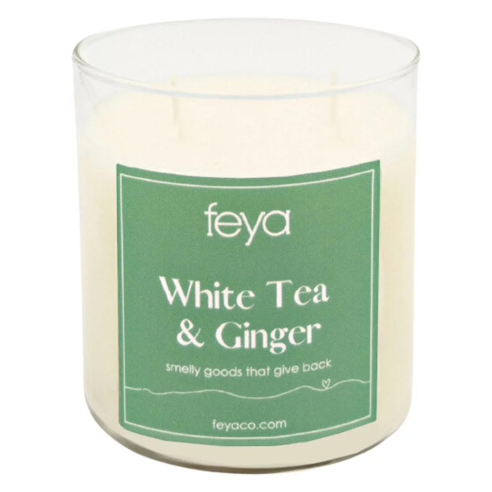 Decorate your living room with this Feya Candle 20-oz. White Tea & Ginger Soy Wax Candle.