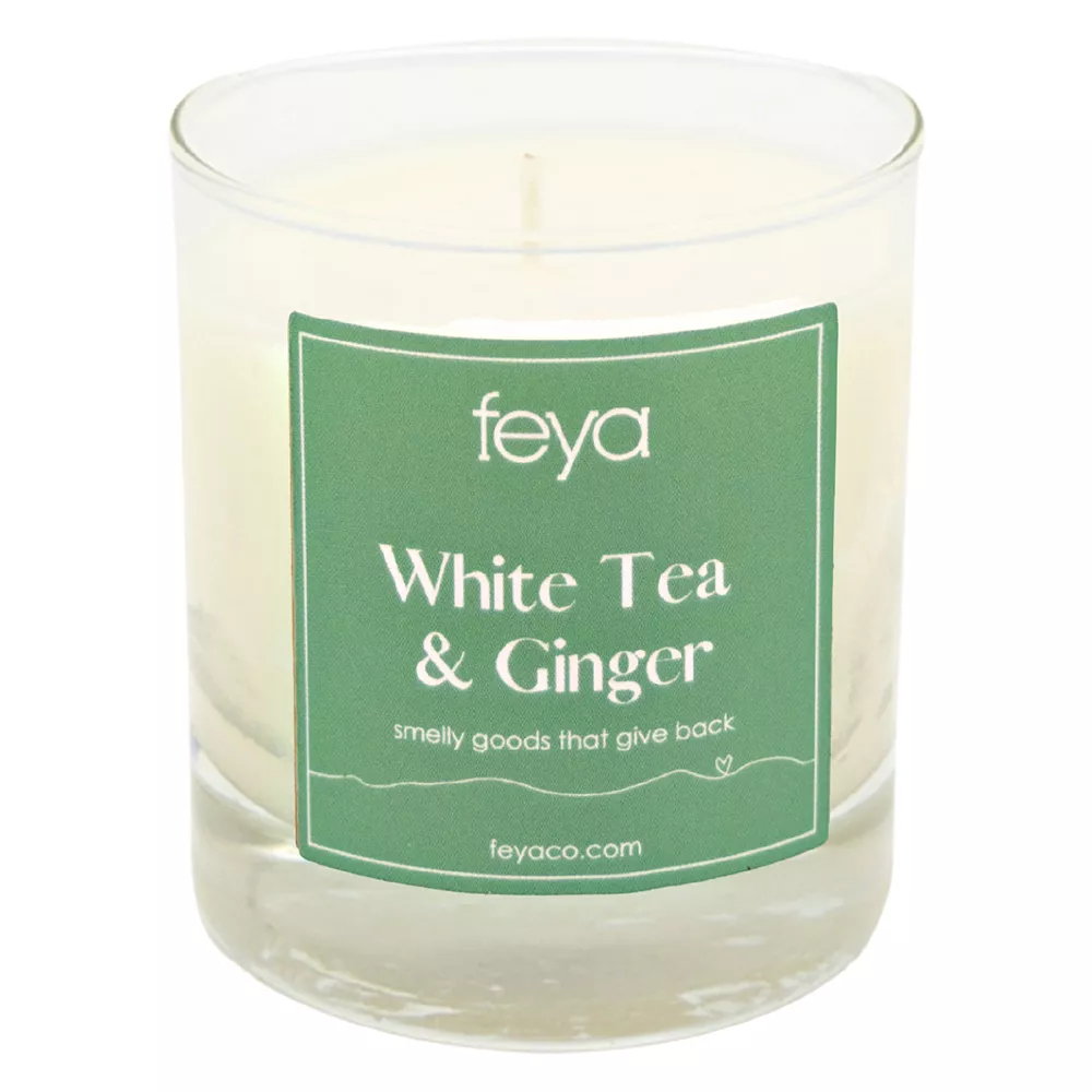 Decorate your living room with this Feya Candle 6.5-oz. White Tea & Ginger Soy Wax Candle.