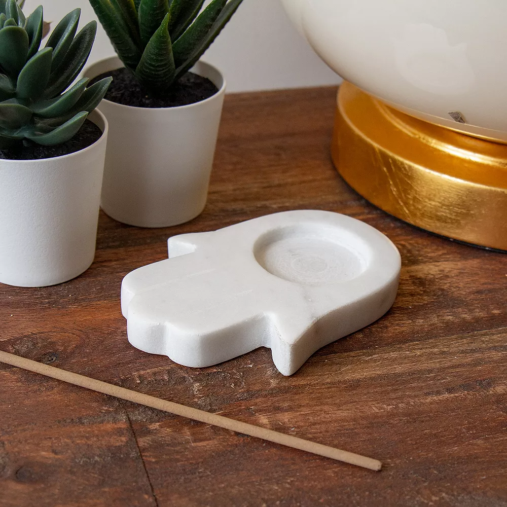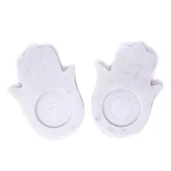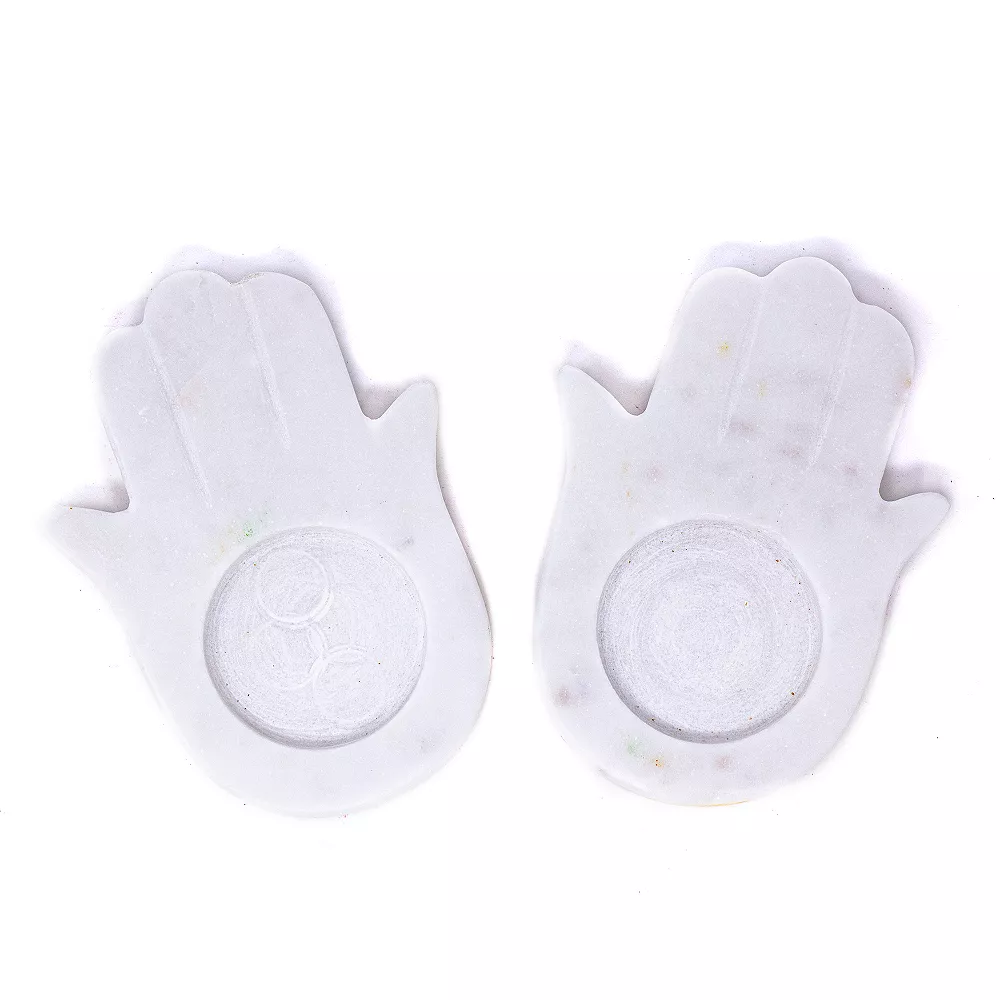The Hamsa hand tea lights are beautifully hand-carved and polished by Indian artisans from local marble. Hamsa hands are known to be protective and bring prosperity and good fortune. This makes a great ethical gift! Product Features: Colors: natural white marble. Materials: Marble. Set of 2. Dimensions: each candle holder is 4.5 x 3 inches. Story behind the Art: The region of Uttar Pradesh, India is known for it hand-carved stone crafts that have been passed down for generations. Artisans use hand tools to carve and smooth out the stonework. Due to the handmade nature, slight variations in size, color, shape, pattern, or other characteristics may be evident. Each piece is truly a unique work of art, lovingly crafted by hand.