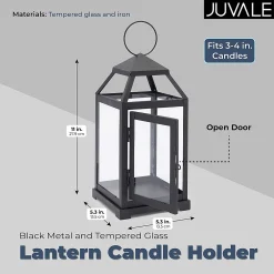 Illuminate your home or outdoor space with this beautiful tempered glass and black metal candle lantern, the reflective glass is sure to magnify romantic candlelight and protect the flame from drafts or breezes. Perfect for indoors and a wide variety of occasions, these black lanterns add elegance to any path or walkway, porch, or patio furniture. Suitable for flameless, tea-light, votive, and small pillar candles, this glass candle holder can be placed anywhere you want extra light in your home or backyard. You will receive one decorative 11-inch black metal and glass candle holder. Juvale™ is a trademark or registered trademark of Juvo Plus, Inc. All other marks shown are owned by their respective owners.