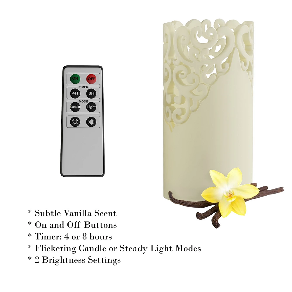 - 8-key remote easily controls the power, timer (4 or 8-hours), 2 brightness levels, and flickering or steady flame option