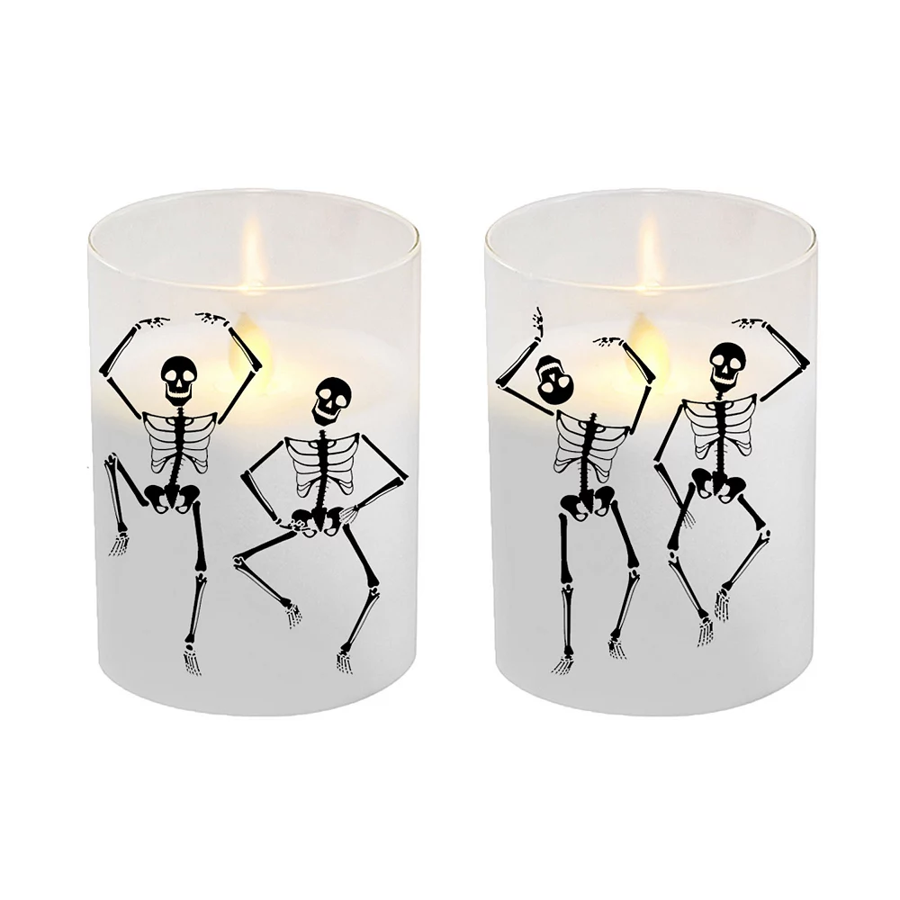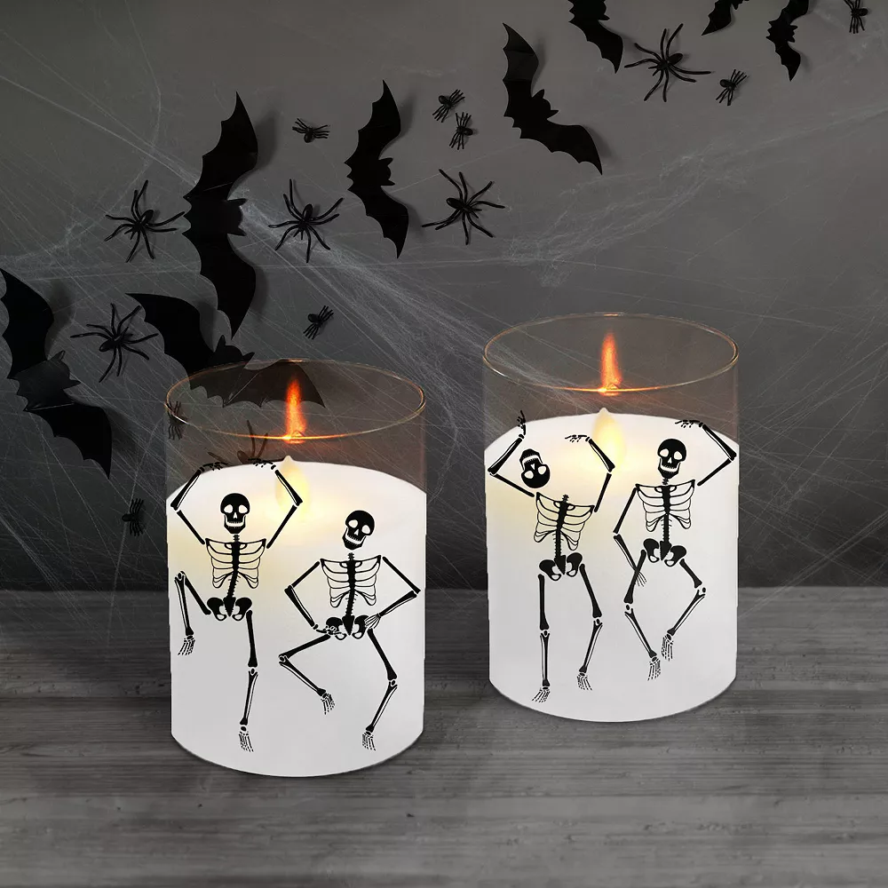 - Set of two flameless candles with skeleton design and flickering amber LED light. Includes a Timer: 6 Hours on and 18 hours off.