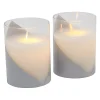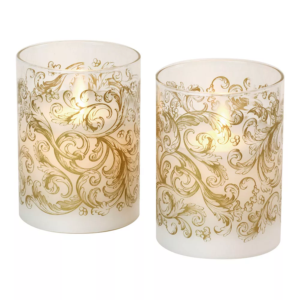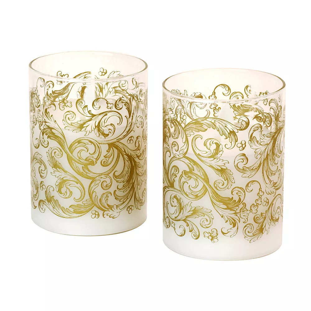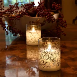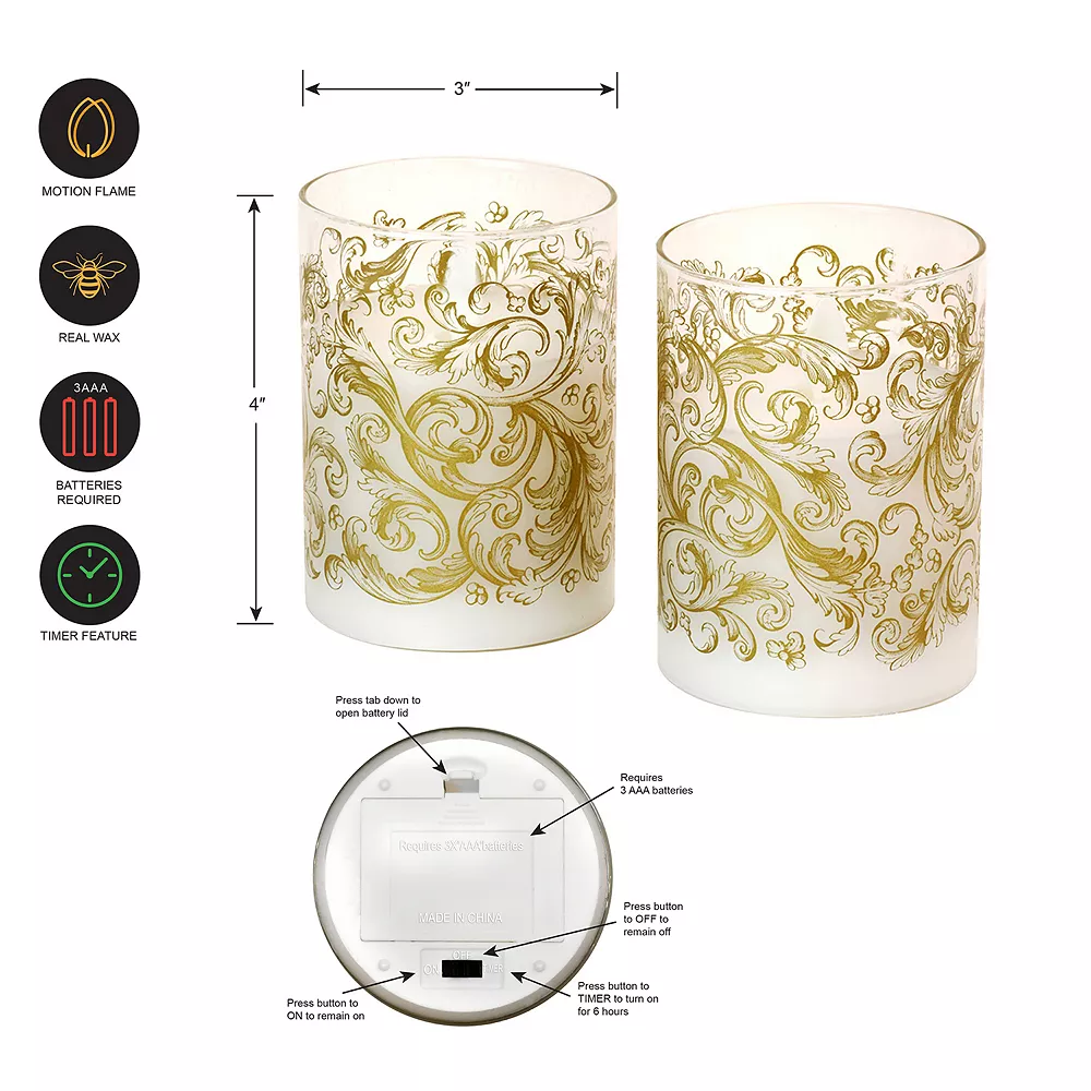 Create a natural looking glow without the flame with this LumaBase Baroque Gold Swirl Battery Operated Wax Candles in Glass Holders with Moving Flame 2-piece Set.