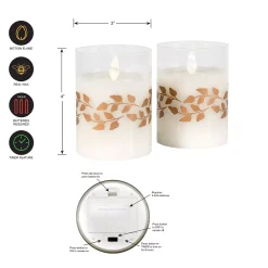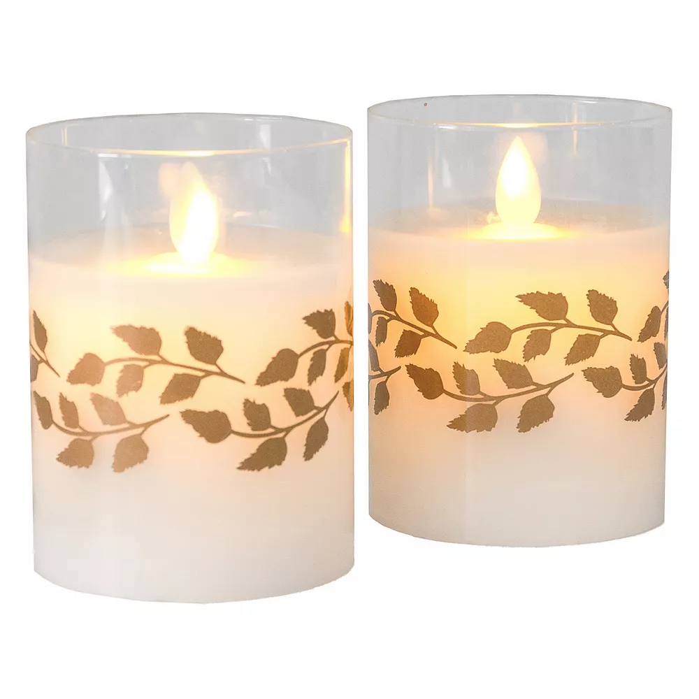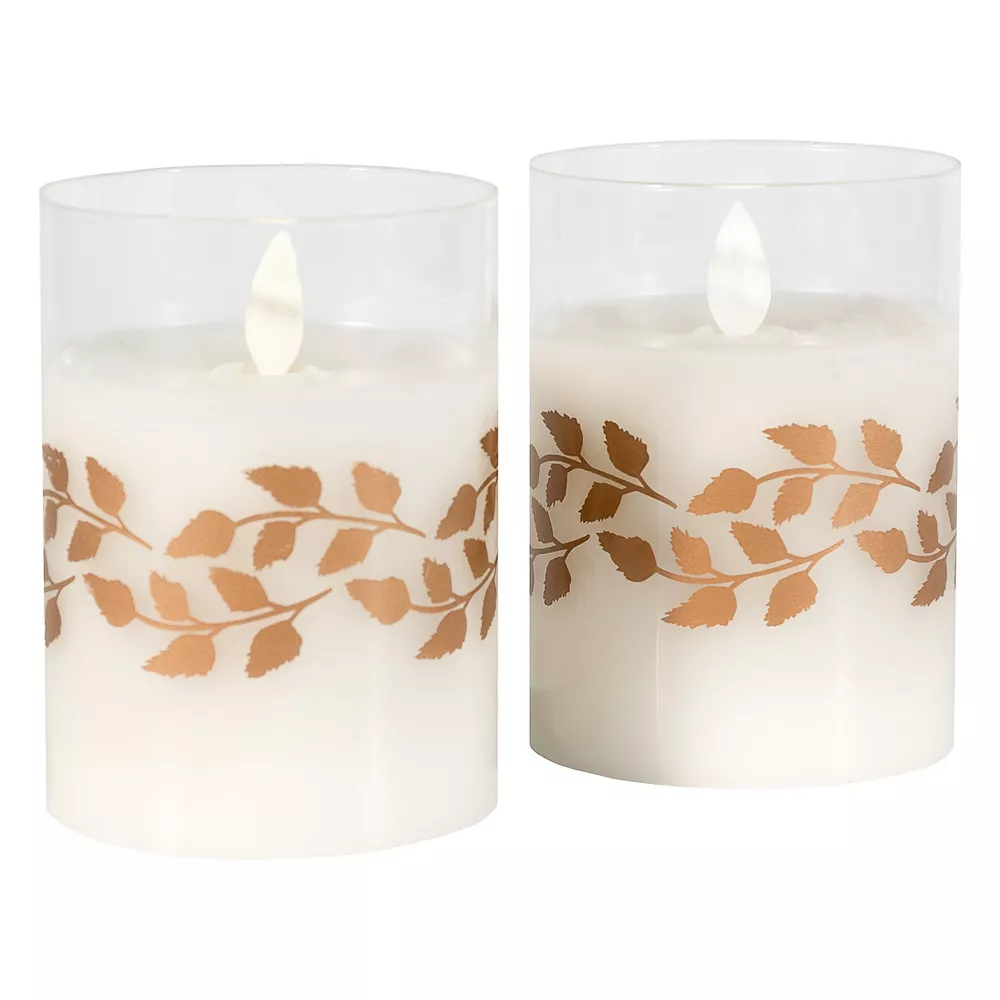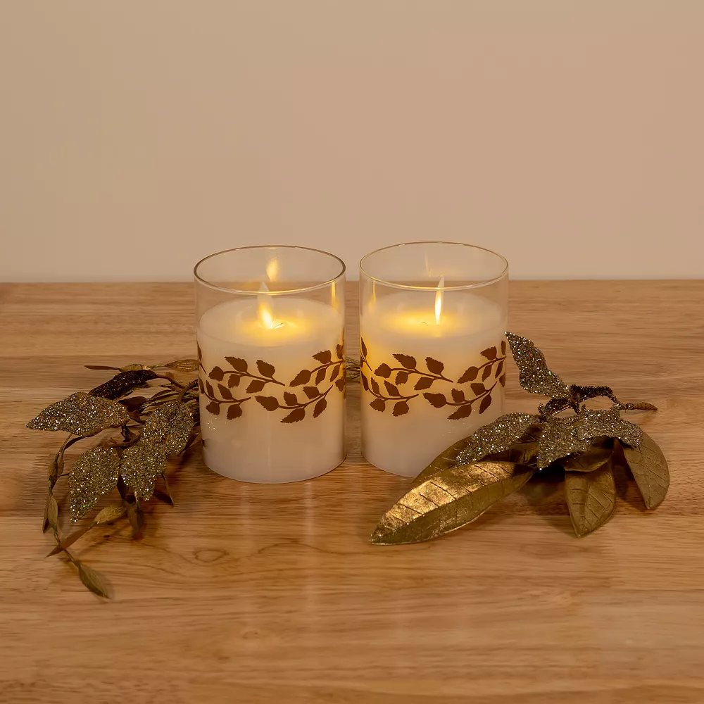 Add warmth and style to any room in your home with LumaBase Gold Wreath Battery Operated Wax Candles in Glass Holders with Moving Flame 2-piece Set.