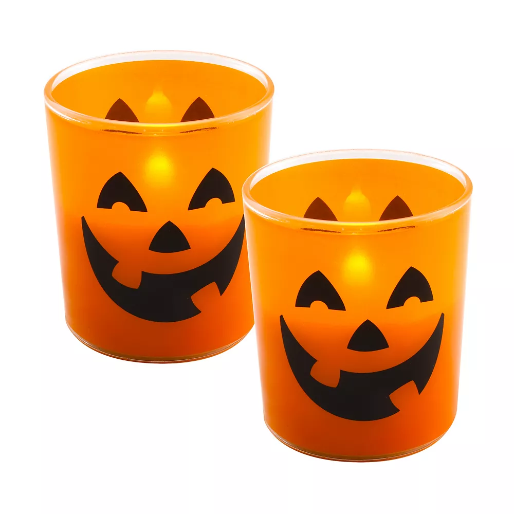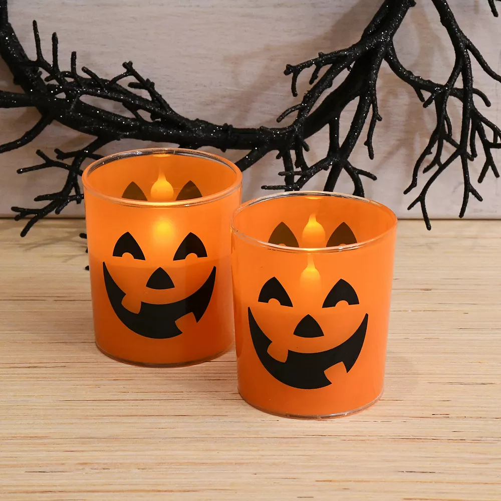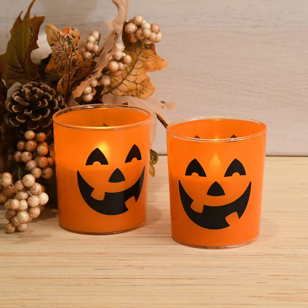 - Set of 2 Battery Operated LED Wax Candles in Orange Glass Holders with Jack O’ Lantern Design