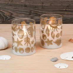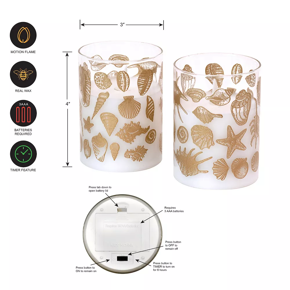 Create a natural looking glow without the flame with this LumaBase Seashells Battery Operated Wax Candles in Glass Holders with Moving Flame 2-piece Set.