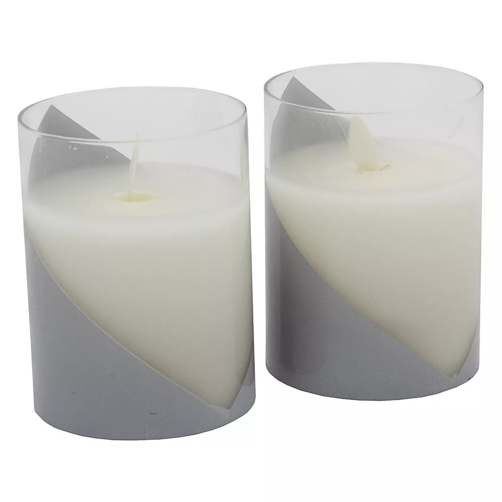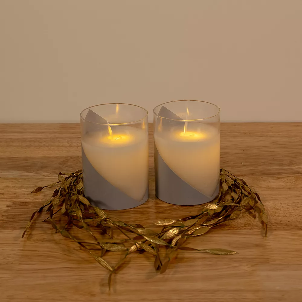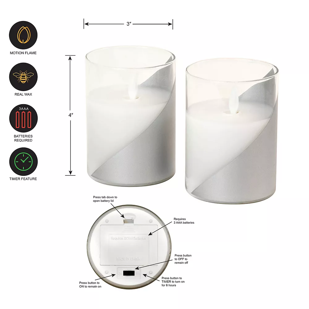 Create an inviting ambiance with this LumaBase Wraparound Silver Battery Operated Wax Candles in Glass Holders with Moving Flame 2-piece Set.