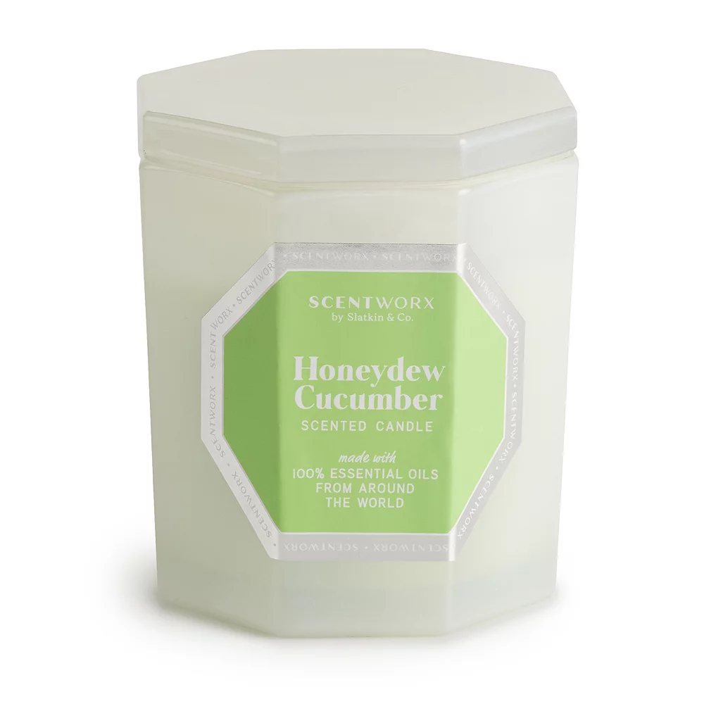 This ScentWorx by Slatkin & Co. Honeydew Cucumber 14.5 oz. Candle will fill any room with an amazing blend of honeydew melon, watery cucumber, sweet honeysuckle and white amber.