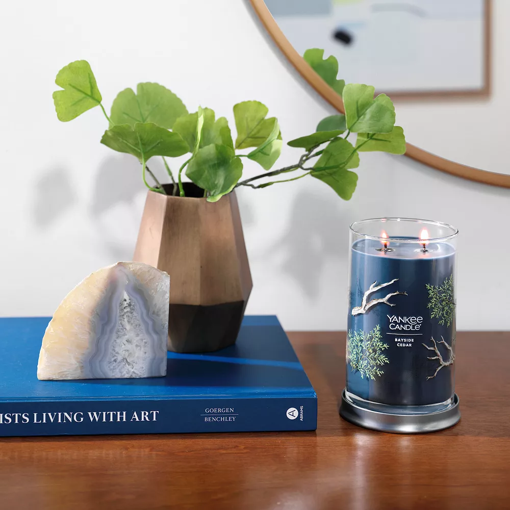 Experience the ultimate scent sensation with this inviting Yankee Candle Bayside Cedar Signature 2-Wick tumbler candle.